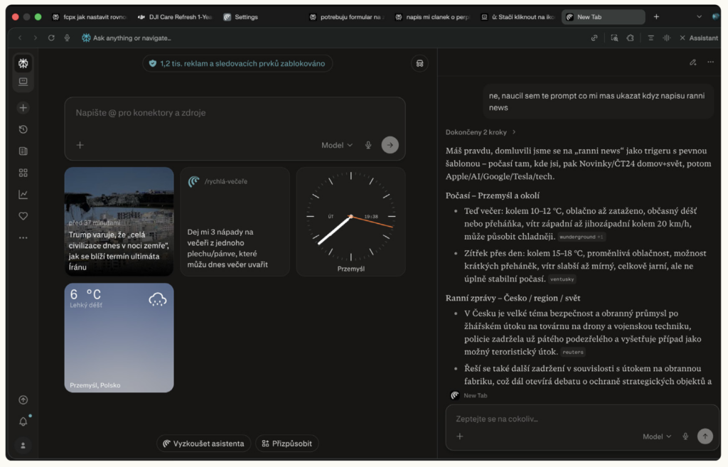 Comet používám denně – ať už na hledání v delších PDF, zpracování materiálů pro práci, prohledávání webu nebo vytváření prezentací z podkladů, které do Comet nahraji. A učím svého asistenta, aby mi každé ráno připravil moje „Ranní News“, jako je počasí tam, kde se právě nacházím, stručné novinky z Česka i ze světa, co je nového v Applu, AI a technologiích obecně. Na to, že momentálně používám free verzi, mě Comet jako prohlížeč baví víc než Safari.
