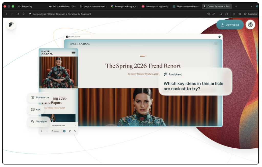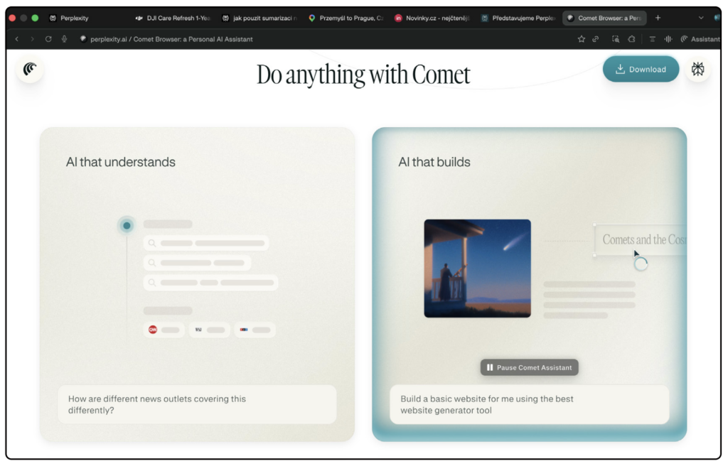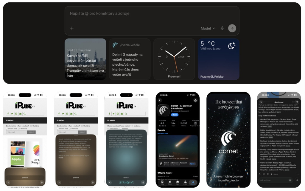 Comet není jen další prohlížeč – je to prohlížeč s integrovaným agentem AI, který si pamatuje, co se na stránkách děje, pomáhá formulovat otázky, shrnuje obsah a zvládne i jednoduché úkoly, jako je psaní e‑mailů, základní analýza textu nebo překlad textu přímo během prohlížení. Vše probíhá v jedné aplikaci, takže nemusíte přepínat mezi různými asistenty AI, prohlížeči a doplňkovými nástroji – všechno vyřídíte v Cometu. Na macOS je Comet dostupný jako desktopová aplikace (synchronizace s účtem Perplexity), na iPadOS a iOS jako samostatná aplikace, která respektuje omezení mobilních systémů, ale zachovává většinu klíčových funkcí a přináší podobný styl práce s AI i na menších displejích.