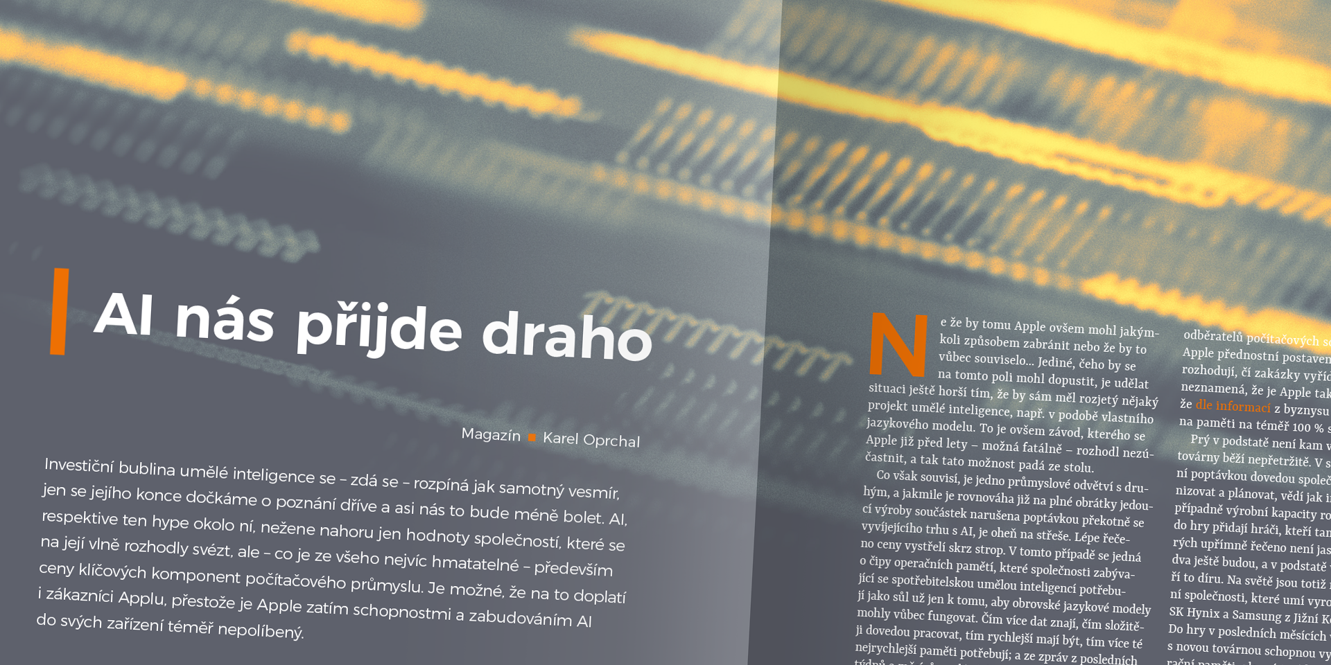 Investiční bublina umělé inteligence se – zdá se – rozpíná jak samotný vesmír, jen se jejího konce dočkáme o poznání dříve a asi nás to bude méně bolet. AI, respektive ten hype okolo ní, nežene nahoru jen hodnoty společností, které se na její vlně rozhodly svézt, ale – co je ze všeho nejvíc hmatatelné – především ceny klíčových komponent počítačového průmyslu. Je možné, že na to doplatí i zákazníci Applu, přestože je Apple zatím . . .