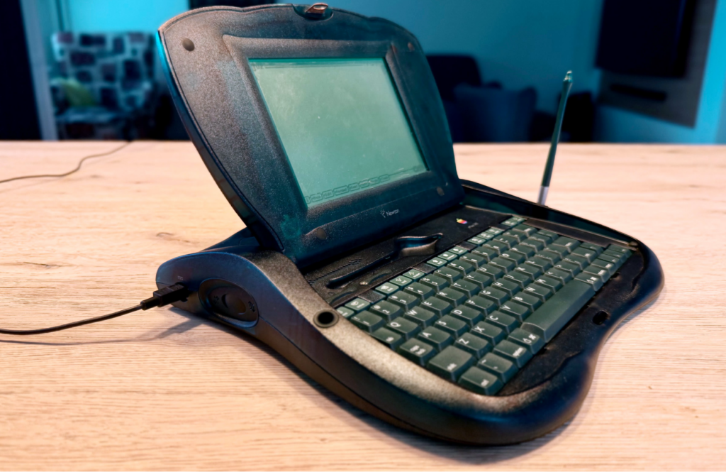 Do Newtonovské rodiny patřil i jeden fascinující příbuzný – eMate 300. V roce 1997 jej Apple uvedl jako studentský notebook s výrazně organickým designem, průsvitným zelenomodrým krytem a zabudovanou klávesnicí. Nebyl to klasický Macintosh, běžel na něm Newton OS, měl monochromatický displej, a hlavněbyl založen na procesoru ARM. To je důležitý technický moment. eMate i pozdější high-end MessagePady (2000/2100) byly první počítače od Applu s architekturou ARM. To, co tehdy vypadalo jako experiment, se o dvacet let později stalo DNA Applu – iPhony, Apple Watch, iPady, Apple Silicon, všechno využívá architekturu ARM. Newton tak vlastně jako první naznačil cestu, na které se Apple stal opět nejúspěšnější technologickou firmou planety.