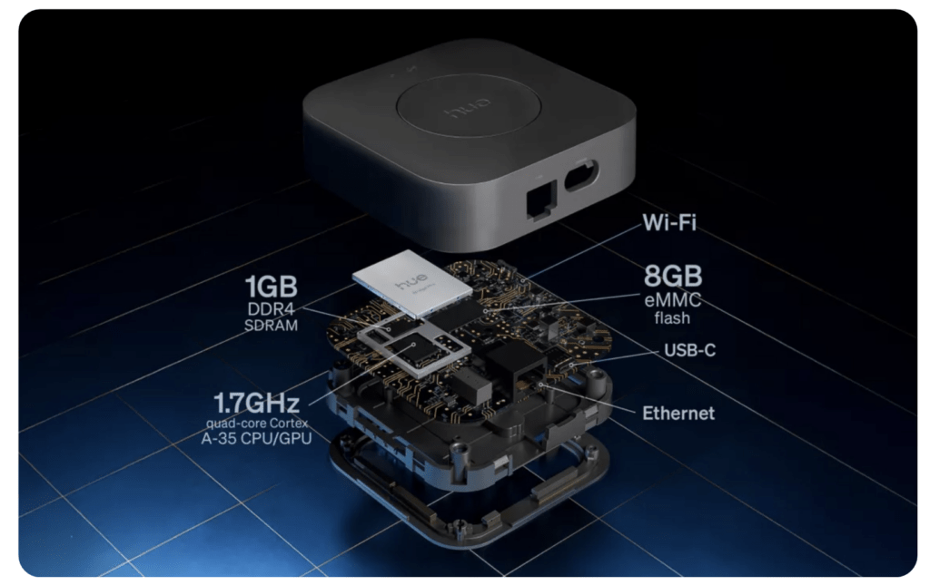 Rozdíl začíná už na úrovni hardwaru. Původní Hue Bridge je dnešním pohledem nevýkonné zařízení s malou pamětí. Nový Bridge Pro je od začátku navržen jako plnohodnotný výpočetní uzel. Má čtyřjádrový procesor ARM Cortex-A53 na frekvenci jednoho gigahertzu, jeden gigabajt operační paměti, osm gigabajtů úložiště eMMC. Pokud vám tyto údaje zní jako parametry levného Raspberry Pi, není to náhoda. Hue přestalo uvažovat o mostu jako o příslušenství a začal o něm přemýšlet jako o lokálním serveru. Tohle není zařízení, které posílá příkazy žárovkám. Tohle je zařízení, které zpracovává světelnou logiku v celém domě o několika patrech.