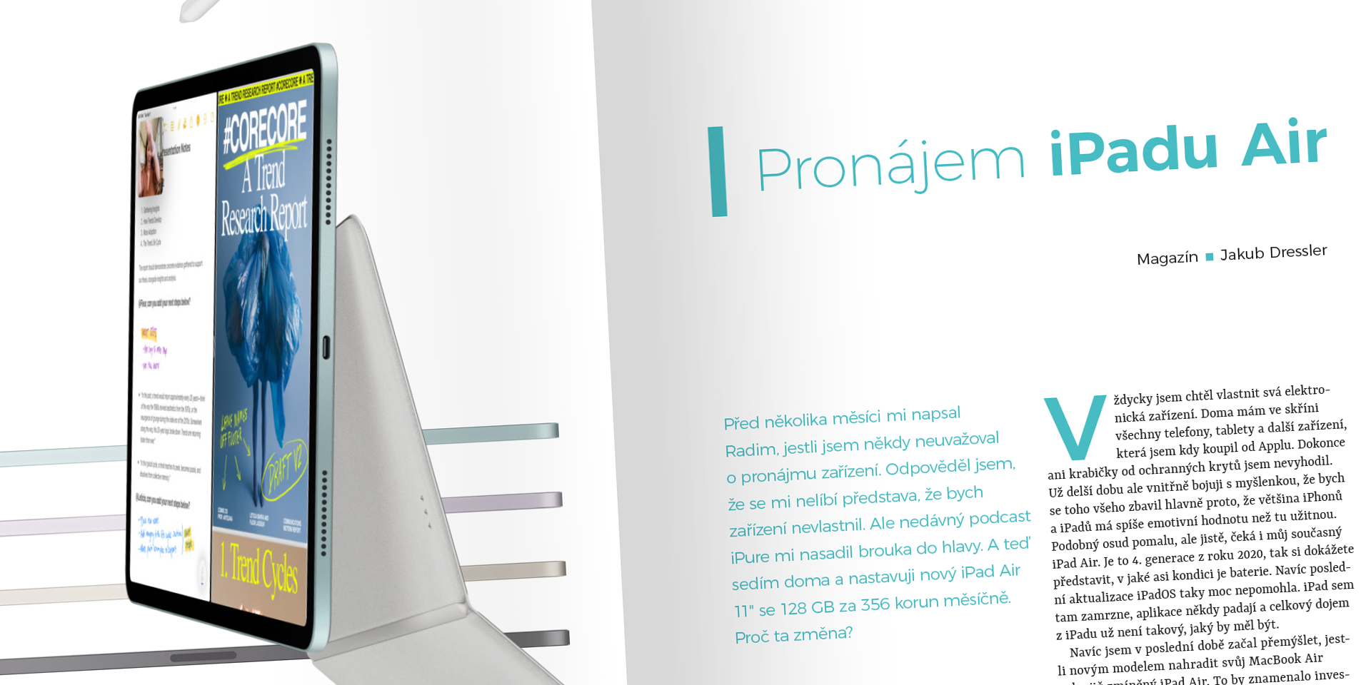 Před několika měsíci mi napsal Radim, jestli jsem někdy neuvažoval o pronájmu zařízení. Odpověděl jsem, že se mi nelíbí představa, že bych zařízení nevlastnil. Ale nedávný podcast iPure mi nasadil brouka do hlavy. A teď sedím doma a nastavuji nový iPad Air 11" se 128 GB za 356 korun měsíčně. Proč ta změna?