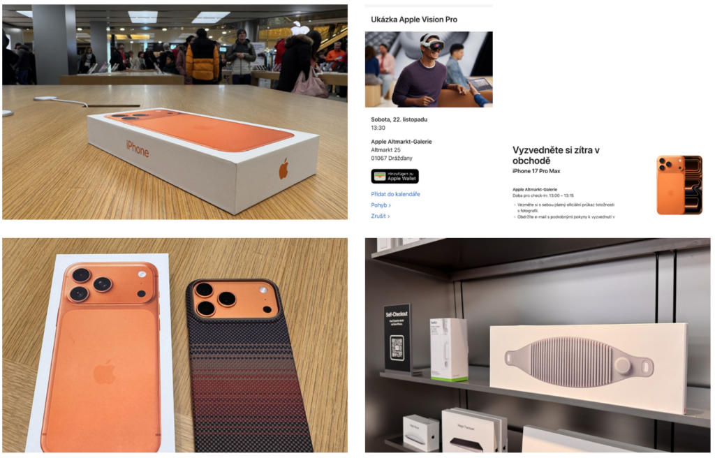 Na konci listopadu mi trpělivost tak nějak přetékala, ne že bych s 15 Pro Max nebyl spokojený – naopak, je to podle mě jeden z nejpovedenějších telefonů ať už kvalitou materiálu nebo kvalitou kamer. Jen se mi nechtělo čekat na update telefonu, který vyšel v září 2025 až na leden 2026. Rozhodl jsem se tedy objednat iPhone v německém Apple Storu, kde z Prahy je ten nejbližší v Drážďanech, a tam kupodivu na skladě byl.
