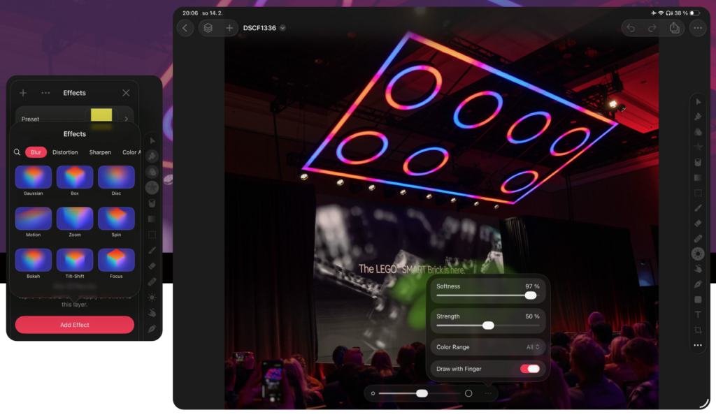 A třetím důležitými jsou nástroje pro lokální úpravy. Můžete zesvětlovat, ztmavovat, přibarvovat, odbarvovat, doostřovat a rozostřovat. Stačí jen zvolit nástroj a dole nastavit velikost štětce, jeho tvrdost a přítlak, a můžete začít dělat lokální úpravy ve snímcích. Na Macu můžete používat myš či grafický tablet. Na iPadu prst nebo Apple Pencil. A právě práce s Apple Pencil je opravdu skvěle intuitivní a příjemná.