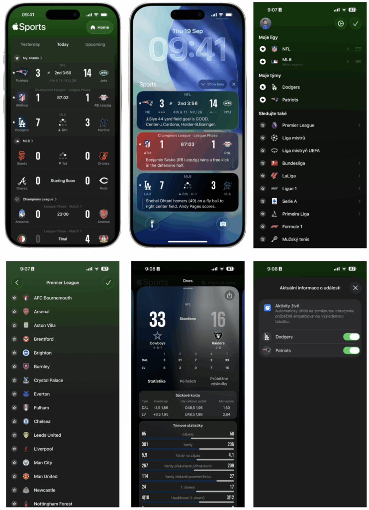 Apple udělal radost českým příznivcům sportů jako je F1, Premier League nebo zámořská NHL. Bezplatná aplikace Apple Sports je nyní dostupná v Česku a dalších zemích v Evropě. Přestože na českých stránkách Applu a v App Storu je aplikace komunikována jako Apple Sports, tak následně v iPhonu je jednoduše pod názvem Sport. Po instalaci aplikace dostanete na výběr vybrat si ze seznamu oblíbených lig a týmů, které chcete sledovat. Pokud primárně sledujete domácí ligy, tak ty ve výběru nenajdete. Sport nabízí fanouškům přístup k výsledkům a statistikám v reálném čase. Díky živým aktivitám navíc aplikace zobrazuje nejaktuálnější informace ia na zamknuté obrazovce iPhonu i na Apple Watch. „Pohlednice“ ze zápasů můžete sdílet dalším uživatelům a uživatelský zážitek si můžete upravit podle sebe s widgety.