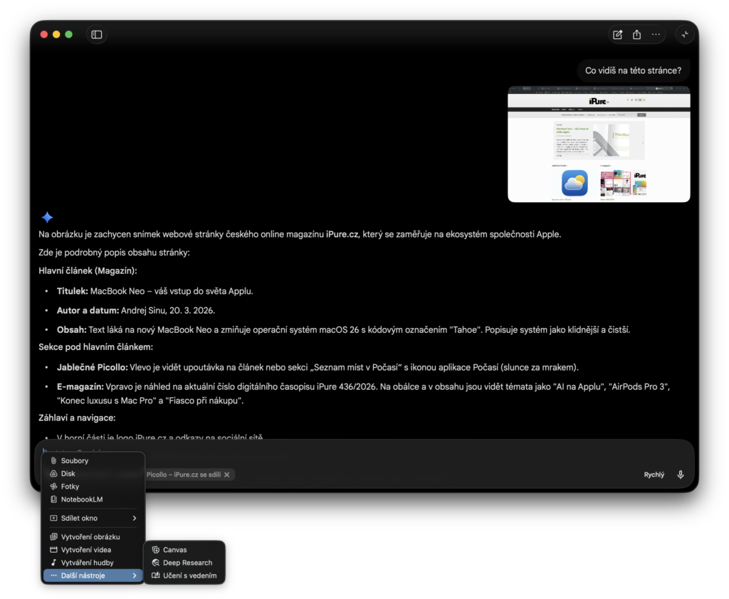 Aplikace umožňuje sdílet cokoli na obrazovce ať už jde o stránku Safari, Zprávy, Mail nebo Pages. Své dotazy tak můžete směrovat na co právě koukáte. Můžete si tak nasdílet obrazovku s oknem emailu a požádat Gemini, aby vám shrnul email. Takto nemusíte nic kopírovat a vkládat.