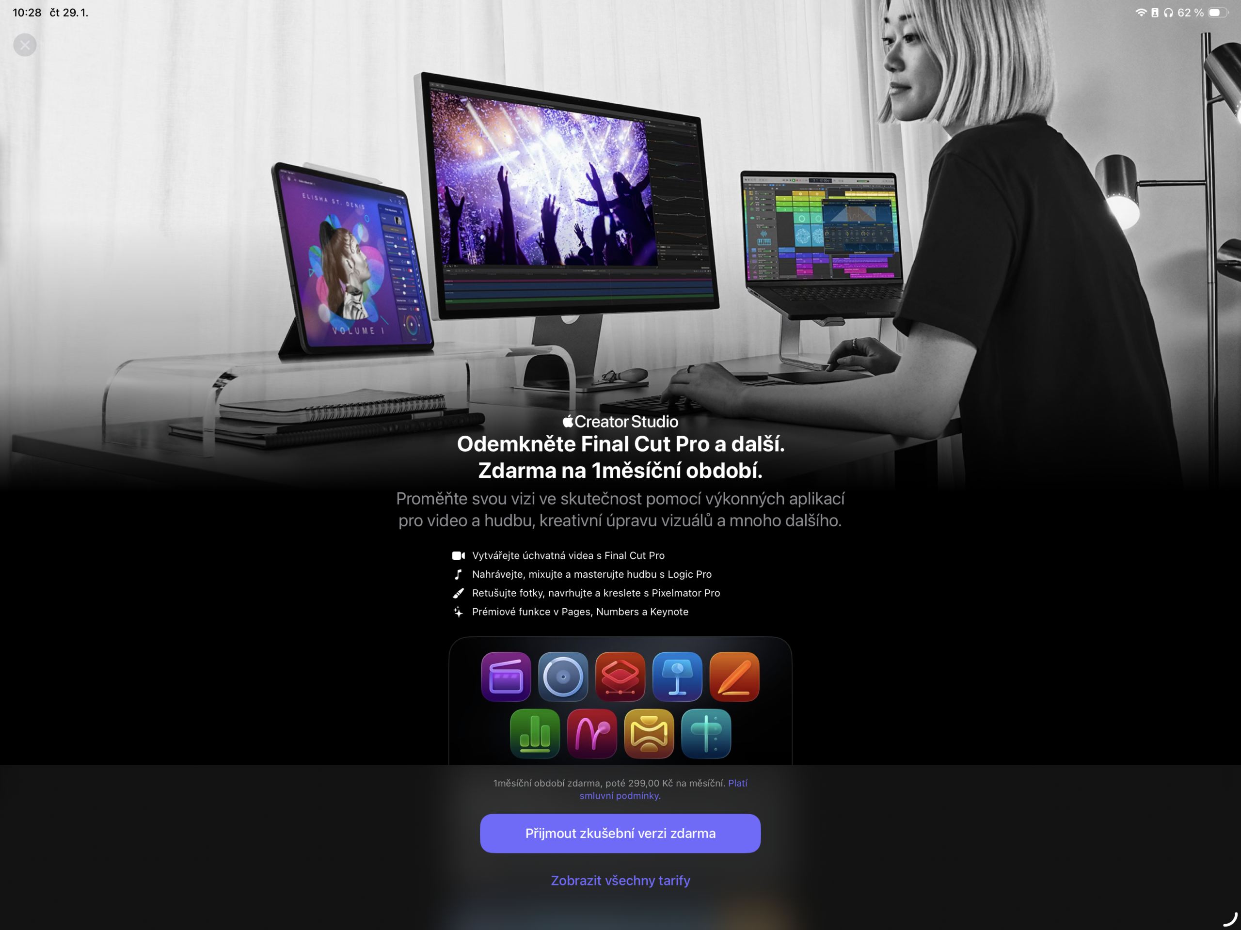 Apple včera vydal své předplatné Creator Studio, které zahrnuje Final Cut Pro, Motion, Compressor, Logic Pro, MainStage, Pixelmator Pro, Pages, Numbers a Keynote. Předplatné vám otevře všechny tyto aplikace pro Mac a většinu také pro iPad (na iPad není verze Motion, Compressor a MainStage). Pro všechny uživatele je předplatné na měsíc zdarma a následně je k dispozici za 299 Kč měsíčně nebo 2 990 Kč ročně (studenti a učitelé mají předplatné za 69 Kč měsíčně, respektive 690 Kč ročně). Uživatelé iWork aplikací se nemusí bát, že by nově museli za Pages, Numbers a Keynote platit. Předplatné otevírá pouze pokročilé funkce a to, na co byli dosud zvyklí, je stále zdarma.