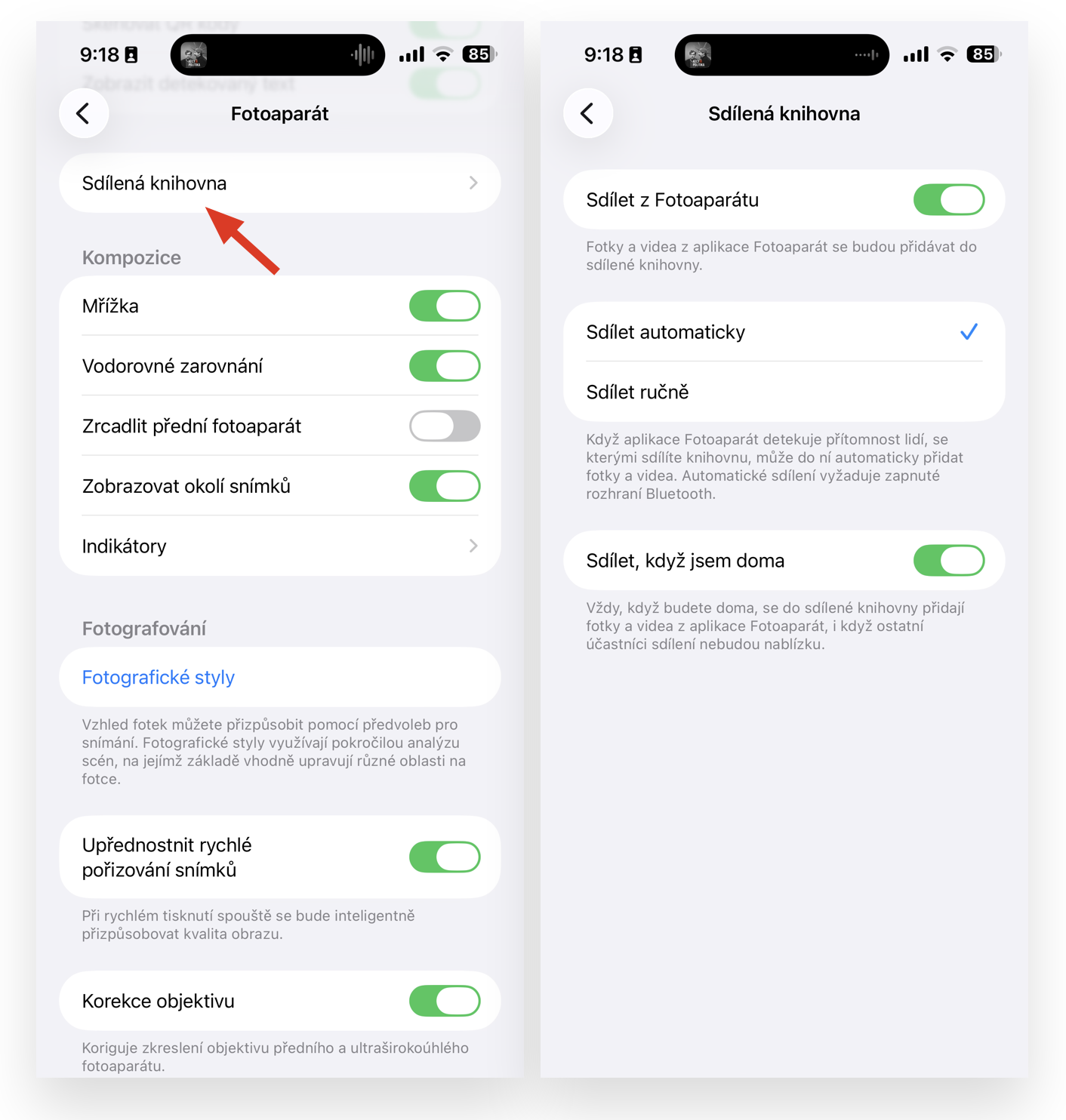 Pokud máte s někým nastavenou sdílenou knihovnu v aplikaci Fotky, tak si můžete nastavit, jestli se mají v některých situacích fotky automaticky přidávat do této knihovny. Najdete to v Nastavení -> Fotoaparát -> Sdílená knihovna. Zde si můžete zvolit, jestli se fotky budou přidávat automaticky nebo je budete přesouvat ručně. Automaticky znamená, že aplikace Fotoaparát během pořizování fotografií detekuje přítomnost lidí, se kterými sdílíte knihovnu. V takovém případě se fotky ve sdílené knihovně zobrazí automaticky všem členům (je potřeba mít zapnuté Bluetooth).