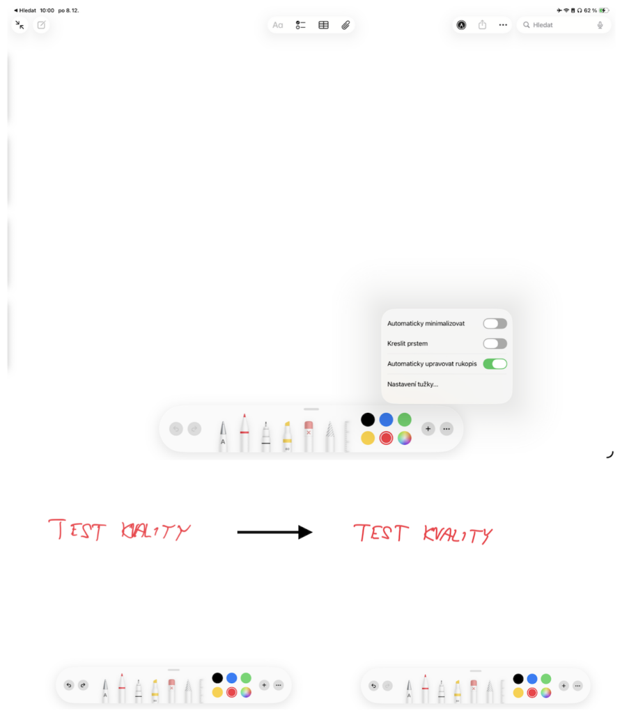 Chcete si psát poznámky Apple Pencilem, ale bojíte se čitelnosti vašeho pravopisu? Aplikace Poznámky má funkci, která vám s tím pomůže. Stačí si otevřít Poznámky, aktivovat anotace Apple Pencilem ikonou v pravém horním rohu vedle vyhledávání. Následně se objeví panel nástrojů, kde můžete vybírat různá pera, barvy nebo přidávat tvary či podpis. Úplně vpravo jsou pak tři tečky pro další nastavení, kde je mimo jiné i možnost Automaticky upravovat rukopis. Po aktivaci kdykoliv něco napíšete tak přibližně po 1-2 vteřinách se v případě potřeby text sám upraví do čitelnější podoby. Pokud nejste s automatickou úpravou spokojeni, tak stačí kliknout na Zpět (případně klávesová zkratka command+Z) a dostanete vaši původní verzi rukopisu.