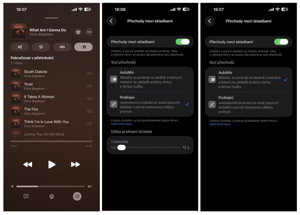 Apple Music nabízí různé možnosti přecházení mezi skladbami. Vedle klasického přecházení, kdy se následující skladba začne přehrávat až po úplném skončení té předchozí, jsou tu další dvě možnosti pro přechod – AutoMix a Prolínání.