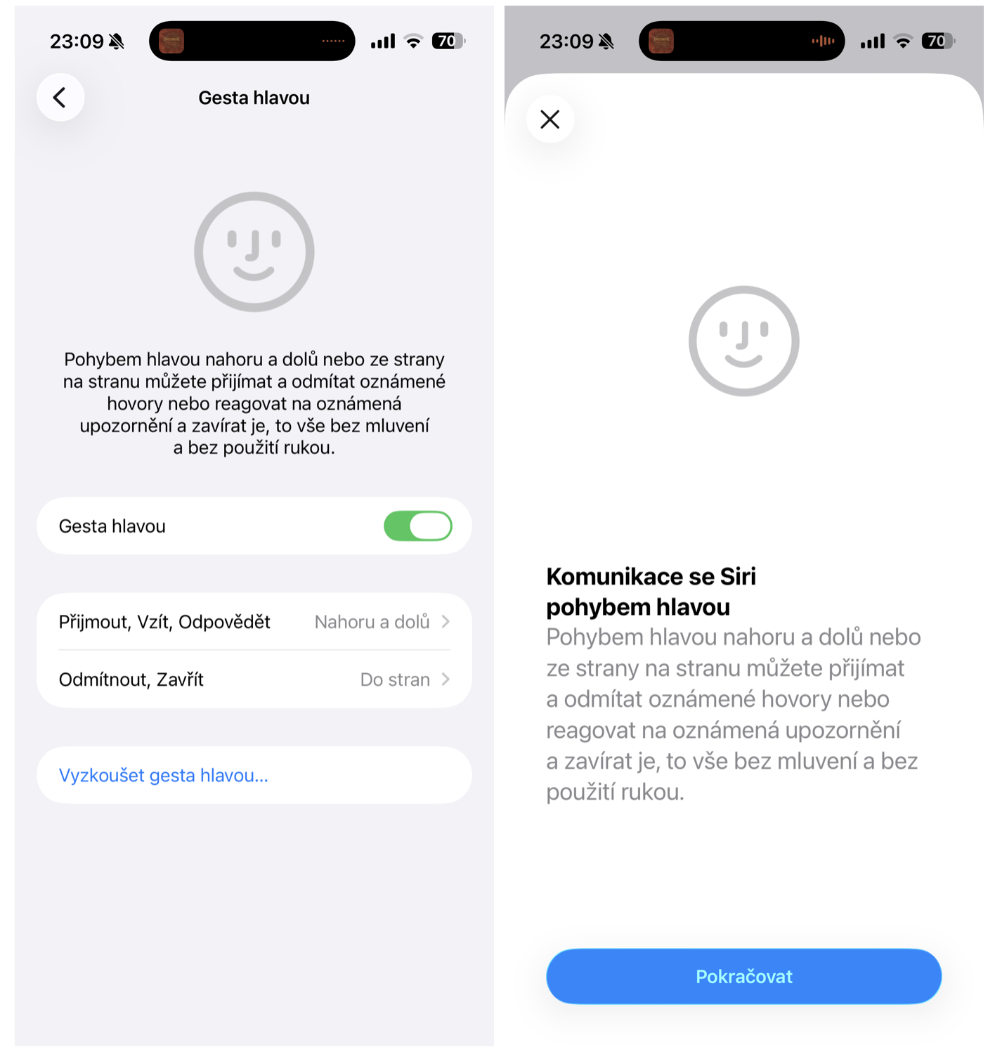 Nasaďte si AirPods a přejděte do Nastavení -> AirPods a téměř dole je sekce Gesta hlavou. Zde si můžete tuto funkci zapnout a nastavit si, jestli přijmutí hovoru budete provádět gestem hlavy nahoru a dolů nebo do stran. To samé pak nastavujete pro odmítání hovorů a oznámení, jen zvolíte tu druhou možnost. Zároveň zde máte možnost si gesta vyzkoušet. Jakmile začnete kývat hlavou, tak uslyšíte jemný zvuk (dal by se přirovnat odrazu míčku o zem). Osobně mi vždy přišlo, že gesto je potřeba dělat až nadbytečně aktivně, a to především u odmítání hovorů, kdy to v uších začalo připomínat divokou výměnu ve stolním tenise.