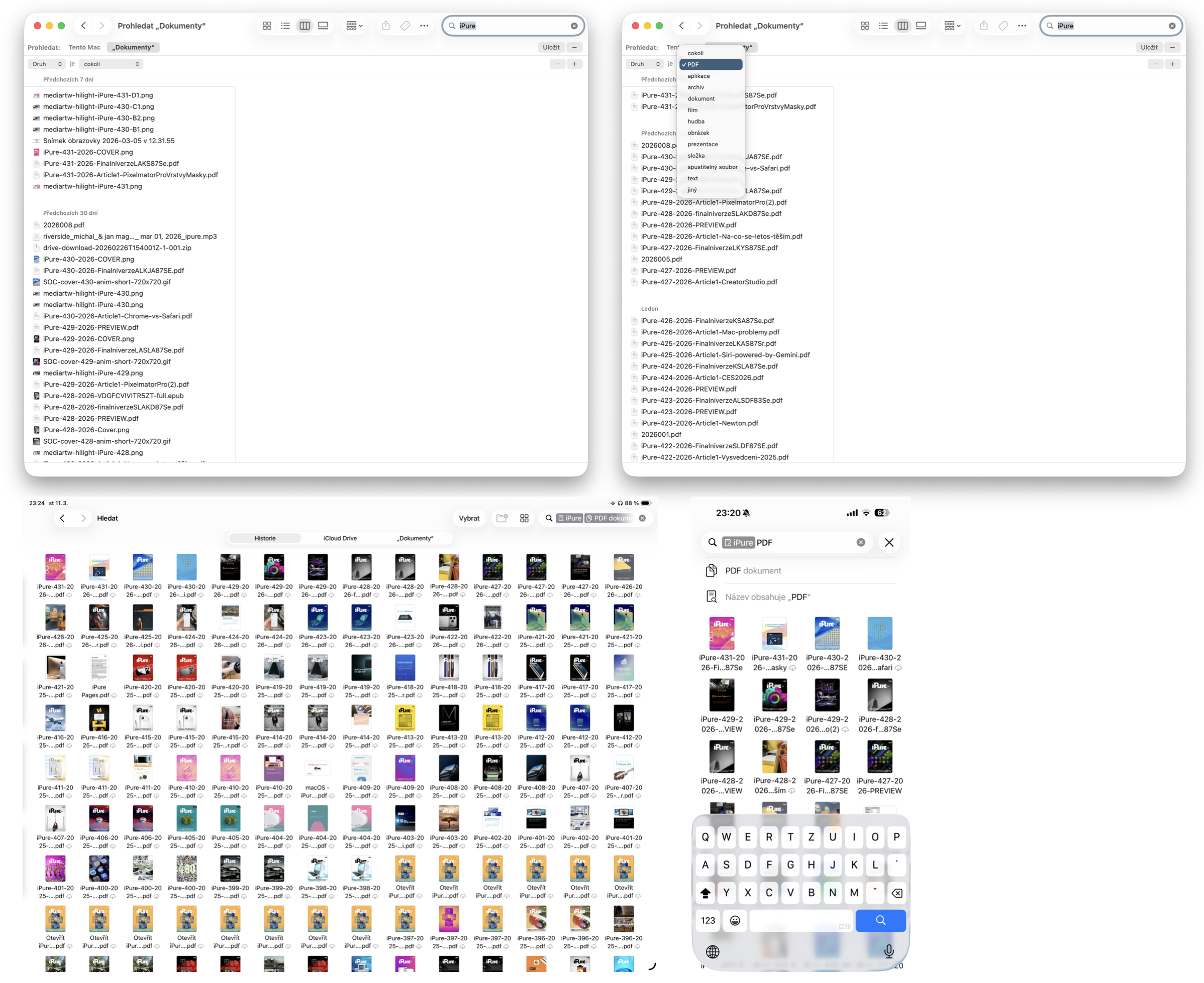 Na iPadOS a iOS to v aplikaci Soubory funguje lehce odlišně, ale dostanete se ke stejnému cíli. Vše totiž zadáváte do vyhledávacího pole. Napíšete nejdřív klíčové slovo a následně za to napíšete „PDF dokument“, kdy se objeví z nabídky možnost filtrovat pouze PDF. Narozdíl od macOS zde ale nemáte možnost zobrazit si všechny možnosti a musíte vědět, co chcete napsat za druh souboru.