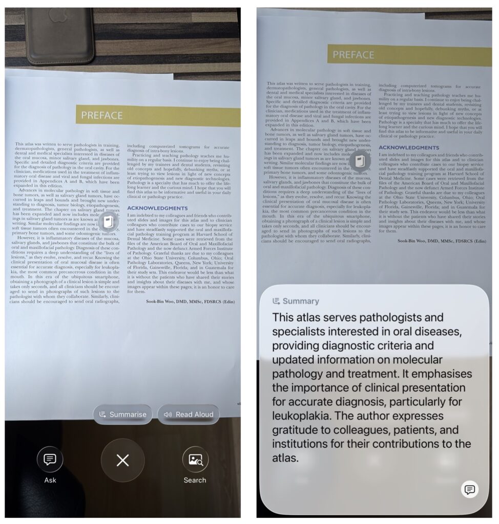 V iOS 26 můžeme získávat bližší podrobnosti také o informacích na displeji. V tomto případě stačí pořídit snímek obrazovky. V dolní části obrazovky následně máte několik možností, jak můžete s obsahem pracovat. Vyhledat podobný produkt na webu po kliknutí na fotku s lupou, pokládat otázky ChatGPT po kliknutí na bublinu s textem, vytvářet události v kalendáři, překládat nebo sumarizovat texty. Konkrétní předměty lze navíc zvýrazňovat a vyhledávat, pokud přes ně přejedete prstem.