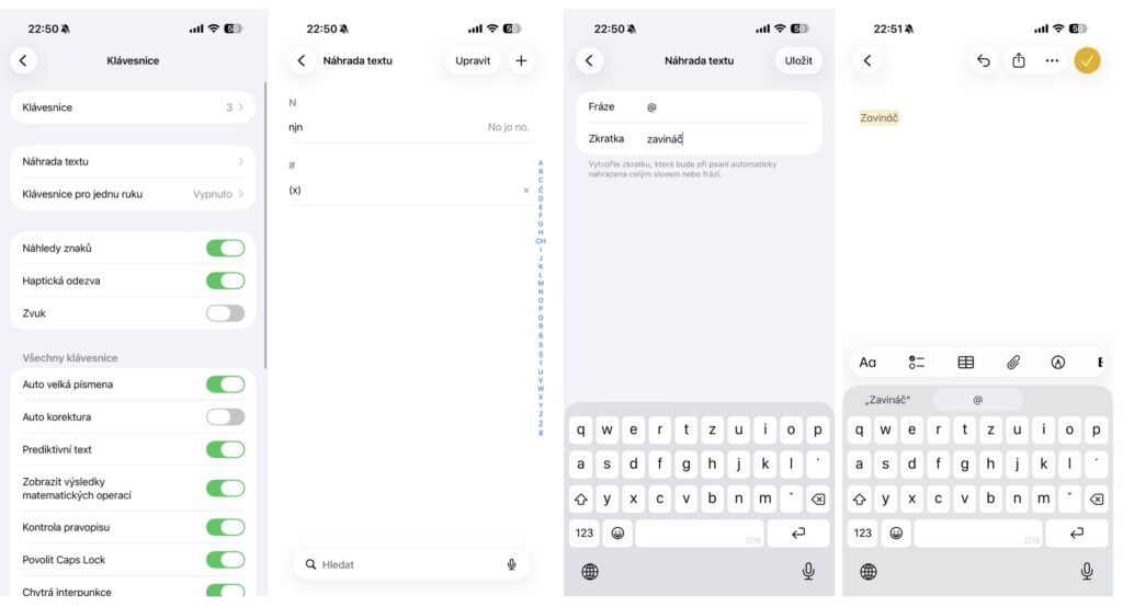 V Nastavení jděte do Obecné -> Klávesnice -> Náhrada textu. Zde pak uvidíte přehled všech vytvořených frází a vpravo nahoře najdete + pro přidání další fráze. Do řádku Fráze pak napište na co chcete, aby se text změnil (například × nebo @) a v řádku Zkratka napíšete text, který tuto změnu nabídne (například tedy (x) nebo zavináč).