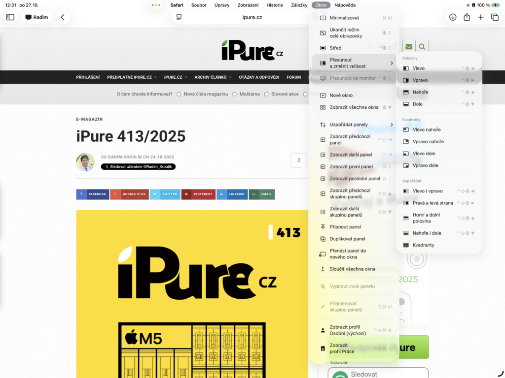 Tento přístup k práci dvou oken je výrazně rychlejší než přes klikání na zelenou ikonu semaforu a výběru z nabídky. Všechny možnosti klávesových zkratek najdete v Menu bar -> Okno -> Přesunout a změnit velikost.