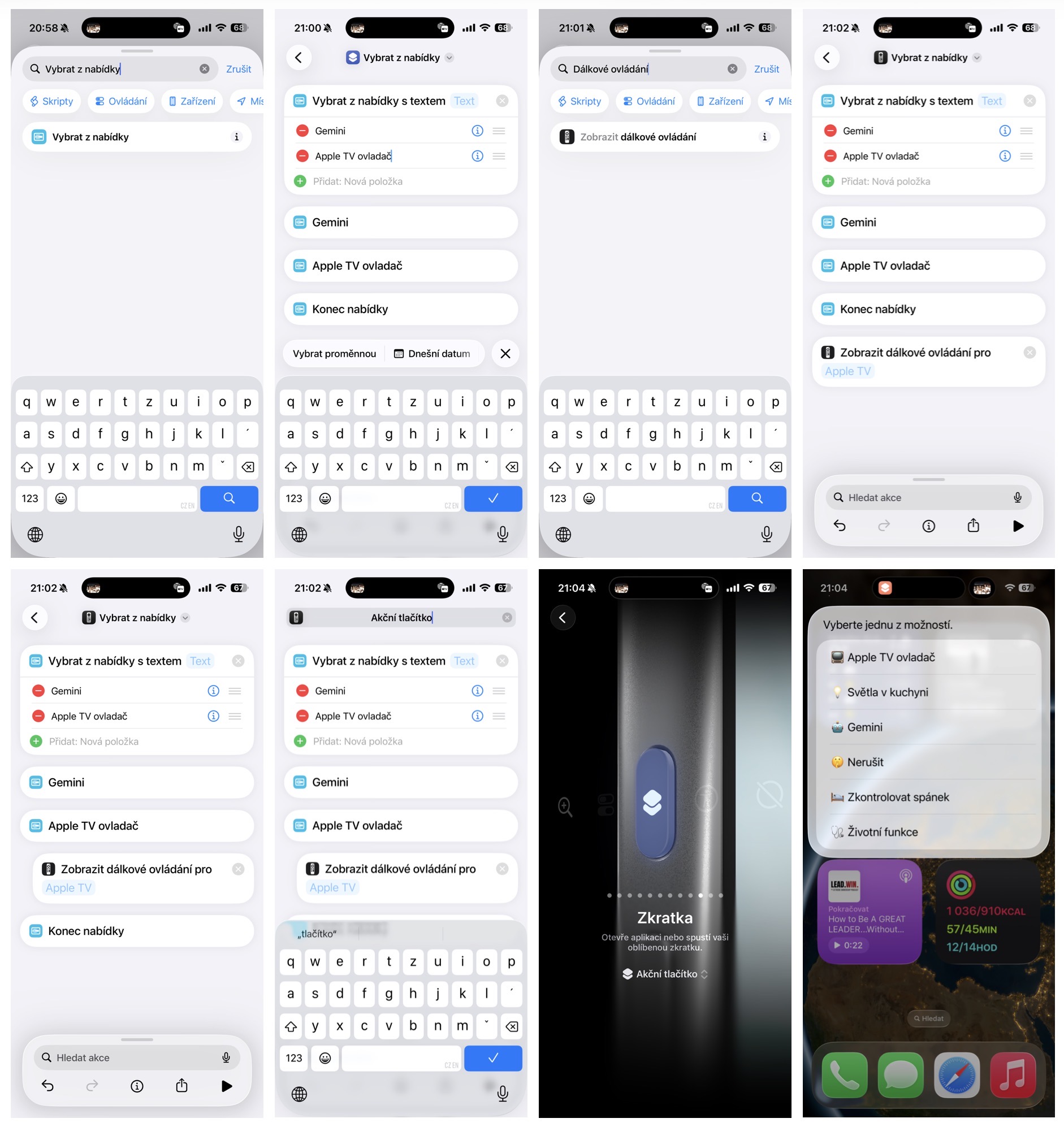 Akční tlačítko na iPhonech nabízí v základním nastavení pouze jednu funkci (tichý režim, režim soustředění, svítilna a další). Jedinou cestou jak vytvořit multifunkční tlačítko je prostřednictvím Zkratky. Otevřete aplikaci Zkratky a klikněte na ikonu + v pravém horním rohu. Do vyhledávacího pole napište Vybrat z nabídky. Následně se objeví nabídka s přednastaveným výběrem Jedna, Dvě. Zde můžete přidávat libovolná pojmenování jako Apple TV ovladač, Světla v kuchini, Gemini, Zkontrolovat spánek apod. Dole pak v Hledat akce najdete požadovanou akci (např. Zobrazit dálkové ovládání). Takto vybraná akce se objeví na konci nabídky. Vy pak tuto akci prstem přesunete na požadované místo. Takto pokračujte až budete spokojeni s vytvořenou nabídkou. Zkratku si nahoře můžete libovolně pojmenovat (např. Akční tlačítko).