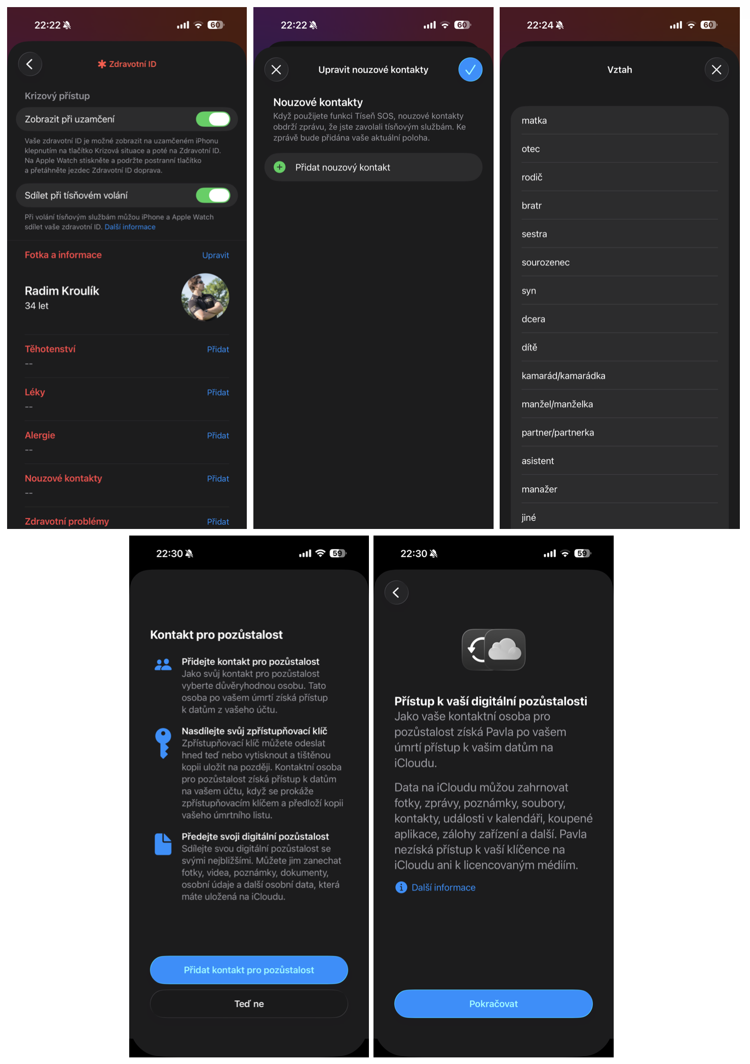 Kromě nouzového kontaktu si v nastavení můžete vybrat i kontakt pro pozůstalost v případě vaší smrti, kdy tato osoba dostane přístup k vašim fotkám, dokumentům a osobním údajům, která máte uložená na iCloudu. Pro vybrání osoby jděte do Nastavení -> vaše jméno -> Přihlášení a zabezpečení a Kontaktní osoba pro pozůstalost. Této osobě nasdílíte přístupový klíč, který si může vytisknout nebo ho pošlete přes iMessage a pak ho bude mít automaticky uložený v Nastavení.