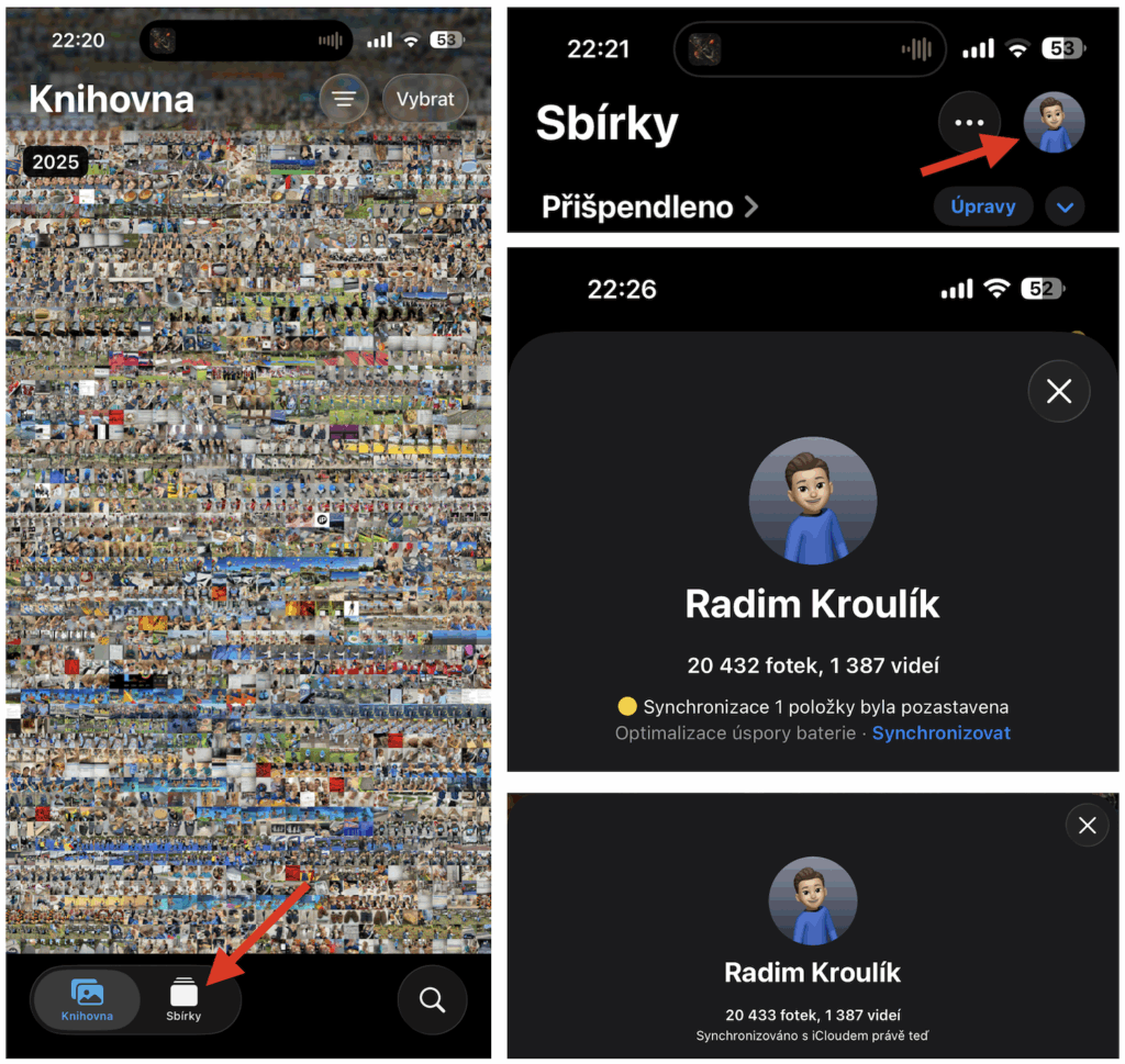 V aplikaci Fotky toto naleznete v sekci Sbírky po kliknutí v pravém horním rohu na svého Avatara. Pod jménem a počtem fotografií a videí uvidíte informaci o synchronizaci. Pokud byla synchronizace pozastavena, tak je zde volba ručně synchronizaci dát pokračovat. Pokud je vše jak má, tak se objeví hláška Synchronizováno s iCloudem.