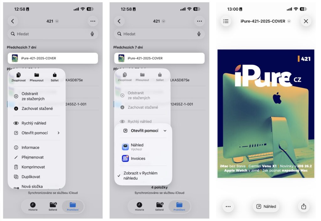 Nový systém umožňuje nastavit si, v jaké aplikaci se bude dokument otevírat a to plošně pro všechny druhu dokumentů (JPG, PDF,…). Stačí na dokumentu podržet prst a následně z nabídky vybrat Otevřít pomocí. Zde dostanete podporované možnosti a jako poslední je Zobrazit v Rychlém náhledu. V takovém případě zůstanete i po otevření dokumentu stále v aplikaci Soubory.