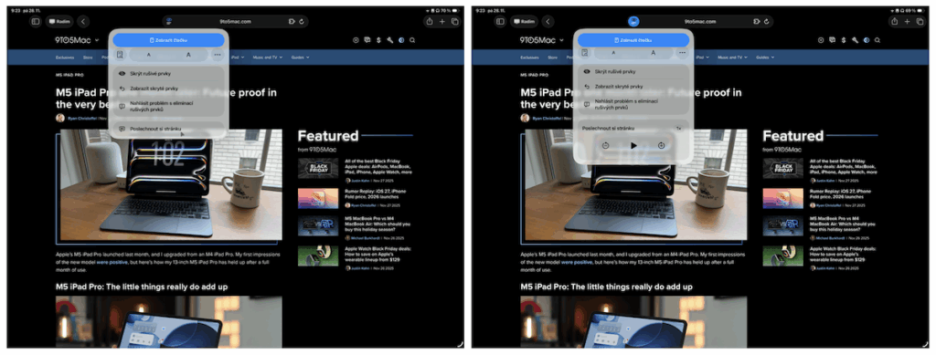 Pokud často čtete články v cizím jazyce, tak Safari nabízí kromě režimu čtečky (ta je dostupná i u nás) také možnost Poslechnout si stránku. Stačí si otevřít požadovaný článek a vlevo vedle adresního řádku je ikona pro nastavení stránky. Zde si můžete nastavit velikost písma nebo zobrazit čtečku a další možnosti, kdy u podporovaných jazyků je dole volba Poslechnout si stránku. Následně se spustí hlas Siri, který předčítá celý text. Zvlášť u delších článků se to může hodit, pokud zrovna nemůžete číst, protože řídíte, vaříte nebo děláte jakoukoliv jinou činnost. Dovolím si ovšem tvrdit, že v současné době je kvalita mluveného slova bohužel podprůměrná.