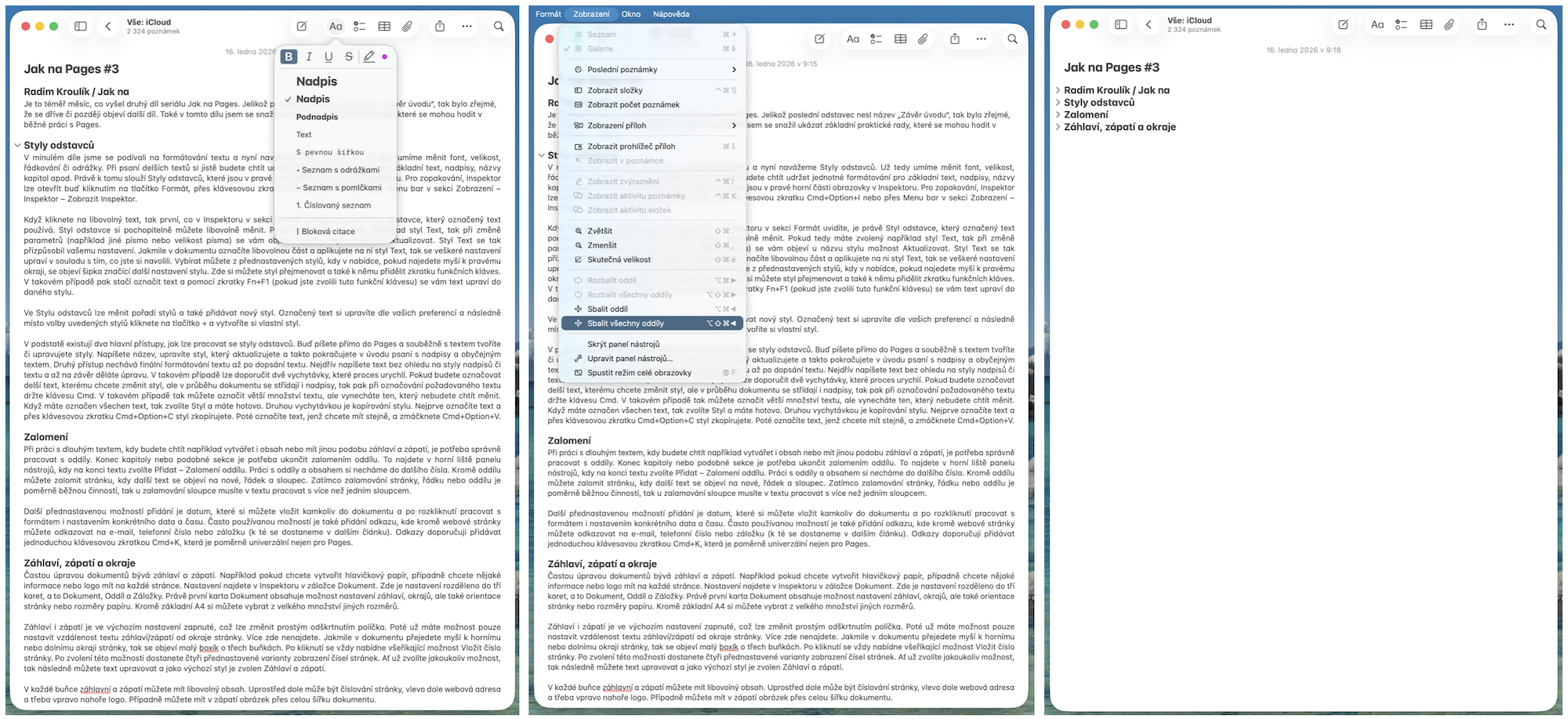 Pokud v Poznámkách chcete psát delší text a orientovat se v jednotlivých tématech, tak lze pracovat s tzv. oddíly. Dokument si můžete rozdělit do nadpisů a textu. V horním panelu nástrojů je symbol „Aa„, kde si můžete vybraný text upravit do odlišného stylu. V příkladu níže jsem do Poznámek vložil jeden ze svých článků a nadpisy jsem upravil do stylu Nadpis. To, že se váš text upravil do stylu Nadpis poznáte podle toho, že vlevo najdete malou šipku, pomocí které můžete celý text sbalit. Pokud máte hodně nadpisů a textu, tak se může hodit funkce „Sbalit všechny oddíly„, kterou najdete v menu bar v sekci Zobrazení (na Macu i iPadu). Tímto krokem se vám veškerý text sbalí a viditelné zůstanou jen nadpisy.