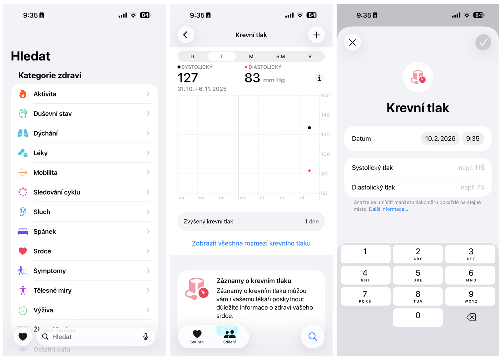 Pokud půjdete do aplikace Zdraví a pokud nemáte kategorii Krevní tlak v Souhrnu na úvodní stránce, tak se k němu dostanete přes vyhledávání. Po kliknutí na lupu najdete Krevní tlak v sekci Srdce. Pokud jste dosud žádná data nezadávali, tak Krevní tlak bude dole v sekci se všeříkajícím názvem „Nejsou k dispozici žádná data“. Po otevření Krevního tlaku kliknete vpravo nahoře na + a následně zadáte systolický a diastolický tlak, který jste si naměřili na tonometru. Po zadání dat už bude aplikace ukazovat podobné přehledy stejně jako ve všech ostatních kategoriích, kde získává hodnoty automaticky z iPhonu nebo Apple Watch.