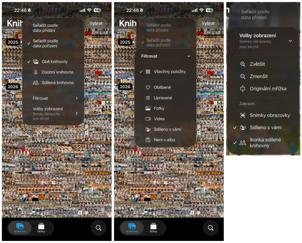 Dále najdete sekci Filtrovat, kde si můžete zvolit například pouze Oblíbené fotografie nebo pouze Videa. Úplně dole pak je sekce Volby zobrazení, které nabízí kromě zvětšování a zmenšování náhledů (to můžete dělat rychleji pomocí gest) také zobrazení čtvercové mřížky nebo originální mřížky. Jako poslední je zde možnost zapnout/vypnout zobrazení snímků obrazovky, fotografií, které jsou sdíleny s vámi a ikonku u fotografií pro sdílenou knihovnu.