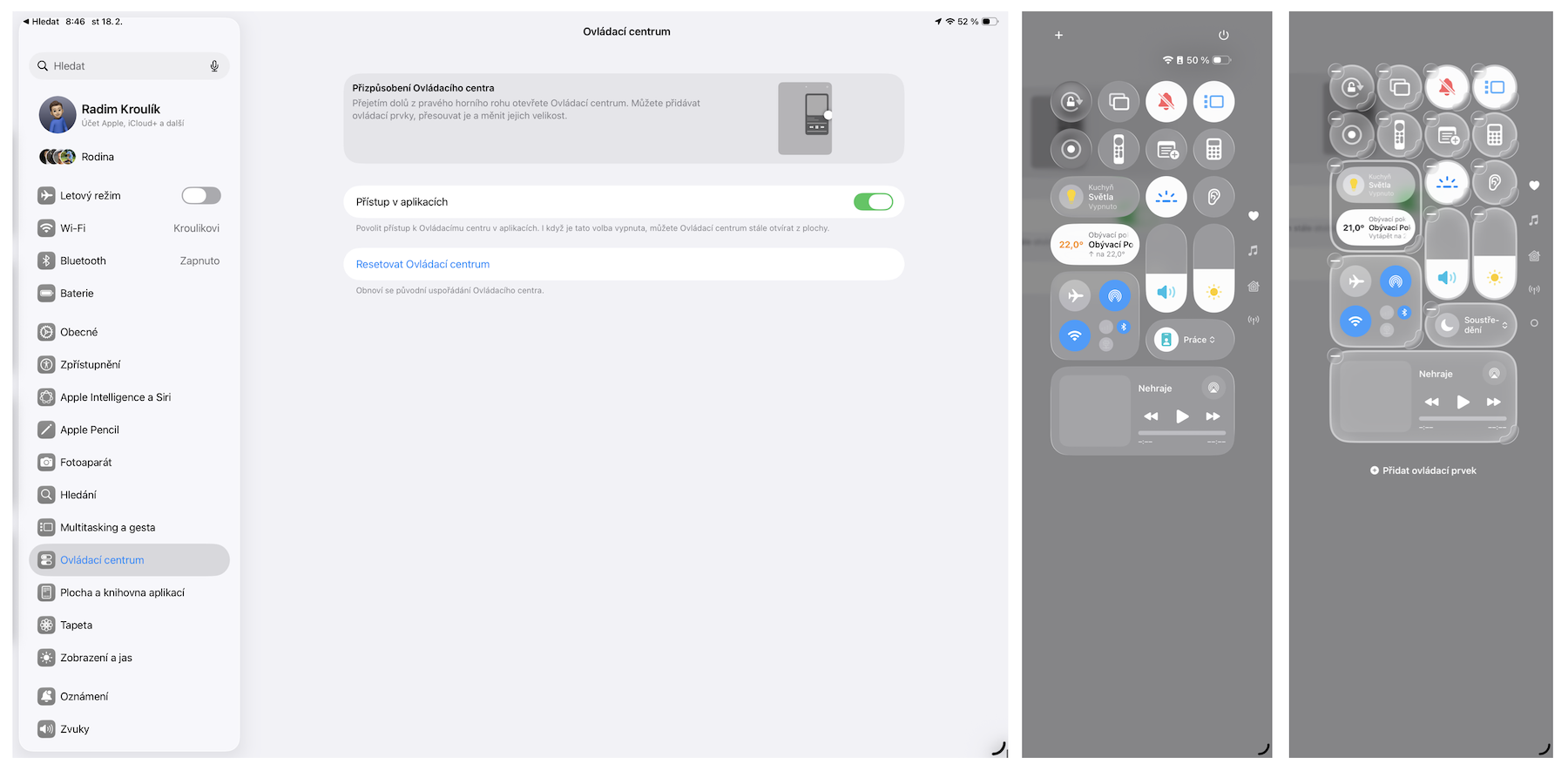 Ovládací centrum na iPhonu, iPadu i Macu nabízí velké možnosti vlastního nastavení, kdy jednotlivé prvky mohou mít různé rozměry a můžete vytvářet více listů Ovládacího centra. Při nastavování se ovšem můžete dostat do fáze naprostého chaosu. Řešením pak může být vrátit podobu Ovládacího centra zpět do původního uspořádání. Stačí jít do Nastavení -> Ovládací centrum -> Resetovat Ovládací centrum. Na Macu musíte jít do Nastavení systému -> Řádek nabídek -> Resetovat Ovládací centrum. Následně můžete používat výchozí podobu nebo se vrhnout do dalších pokusů vlastní úpravy. Pro vlastní uspořádání stačí v Ovládacím centru (to otevřete krátkým přejetím prstu z pravého horního okraje displeje směrem dolů; na Macu kliknutím na ikonku v Menu Bar vpravo) kliknout na +. Na Macu je pak dole tlačítko Upravit ovládací prvky.