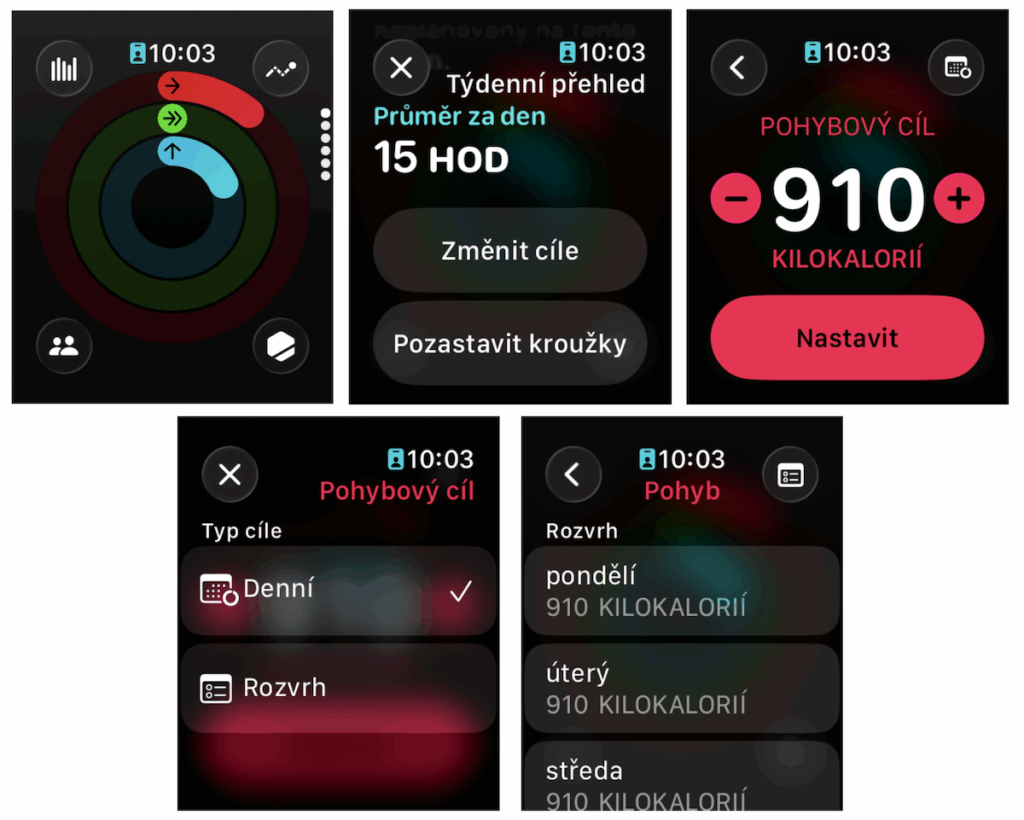 V aplikaci Aktivita na hodinkách si v levém horním rohu vyberte zobrazení přehledů. Úplně dole pod statistikami najdete možnost Změnit cíle. Objeví se možnost změnění cíle na všechny dny, ale v pravém horním rohu najdete ikonu s rozvrhem. Zde je na výběr mezi nastavením denního cíle a rozvrhem. Při volbě rozvrhu se dostanete do nastavení jednotlivých dní, kdy každý den můžete mít jinou hodnotu. Pokud se zrovna dostanete mimo váš běžný harmonogram, tak si cíl pro ten daný den můžete upravit tak, jak jsme si již ukazovali.