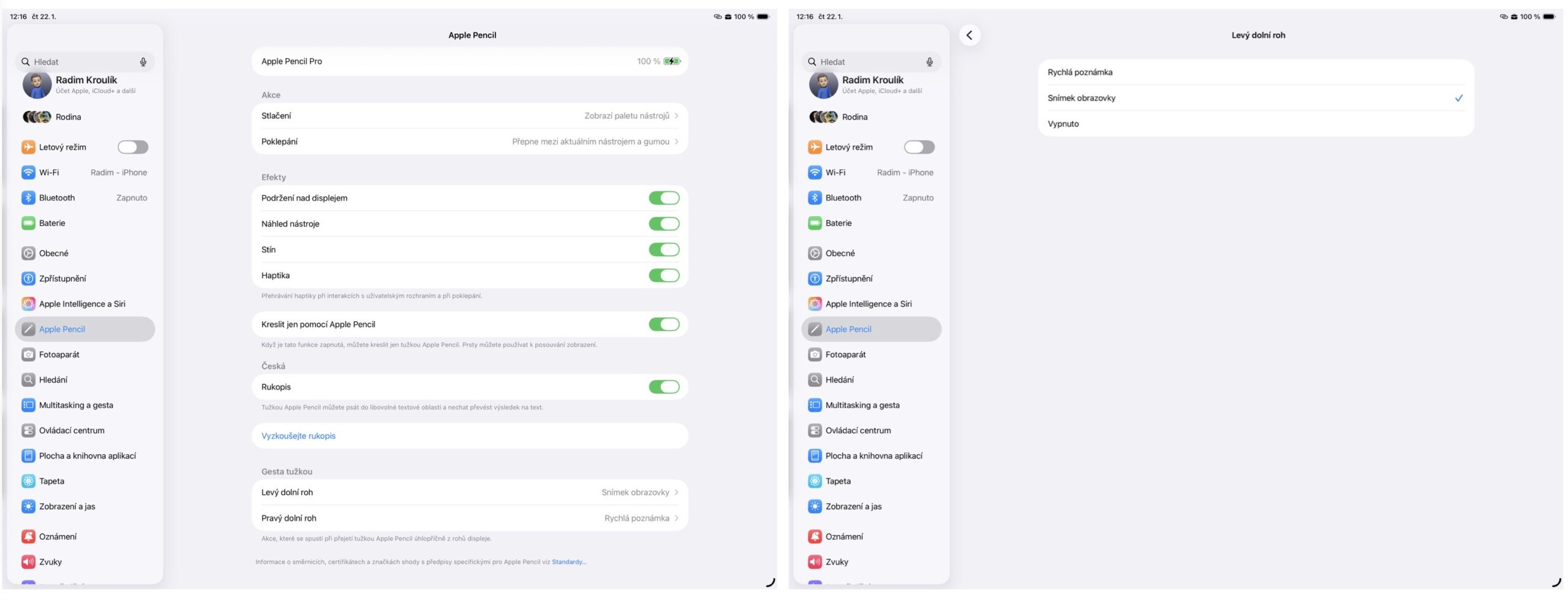 Apple Pencil umožňuje na iPadu rychlým gestem vyvolat konkrétní akci. Na výběr máte dvě možnosti, a to udělat snímek obrazovky nebo vytvořit rychlou poznámku. Třetí možností je pak toto gesto vypnout. Gesto vyvoláte kdykoliv, kdy přejedete tužkou z levého nebo pravého spodního rohu obrazovky úhlopříčně směrem do středu displeje.