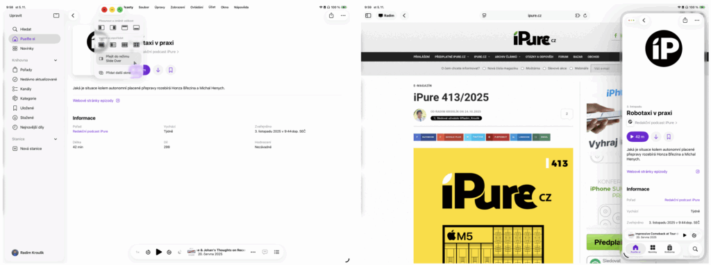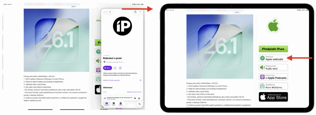 iPadOS 26 přinesl kompletně předělaný multitasking, který vedle již stávajícího režimu Stage Manager umožnil uživatelům práci s okny, tak jak jsou zvyklí z macOS. Tato změna ovšem přinesla také odstranění režimu Split View se Slide Over. Možnost Slide Over se s aktualizací iPadOS 26.1 vrací zpět. Nyní je možné jednu aplikaci přepnout do tohoto režimu, kdy si následně můžete toto okno v případě potřeby vytáhnout a poté zase schovat. Okno ve Slide Over může být pouze jedno, ale můžete libovolně měnit poměr stran, což dříve nebylo možné.