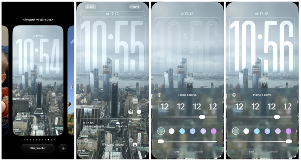 Liquid Glass design prochází i po zveřejnění ostré verze iOS 26 změnami. Tou poslední v iOS 26.2 je možnost upravovat si posuvníkem intenzitu průhlednosti „skla“u hodin na zamčené obrazovce. Jak nastavit hodiny s efektem Liquid Glass jsme si ukazovali už v září. Na zamčené obrazovce podržíte prst a zvolíte Přizpůsobit. Zde kliknete na hodiny a nově je pod výběrem barvy fontu posuvník, kterým můžete upravovat, jestli efekt skla bude více čirý nebo naopak tónovaný. Na závěr dáte hotovo v pravém horním rohu a máte nastaveno.