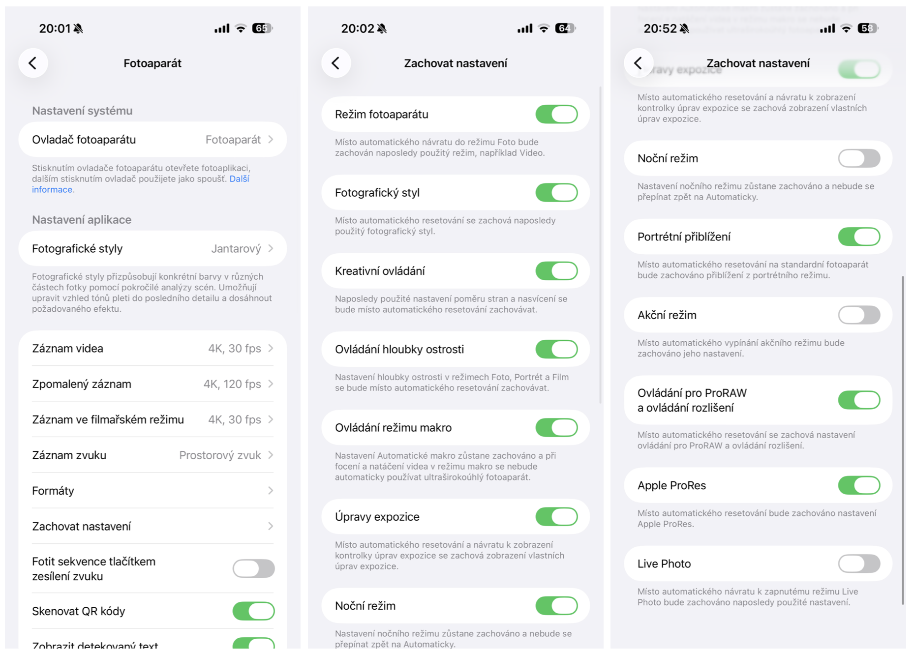 Osobně mám dvě funkce, u kterých mám zachování nastavení vypnuté. Akční režim – použil jsem ve velmi specifické situaci a následně jsem přehlédl, že ho již nepotřebuji. Live Photo – u focení lidí preferuji Live Photo, ale v případě přírody občas přepnu do 48MP rozlišení, které není podporované v Live Photo režimu. Následně se mi stávalo, že jsem zapomněl znovu Live Photo režim aktivovat.