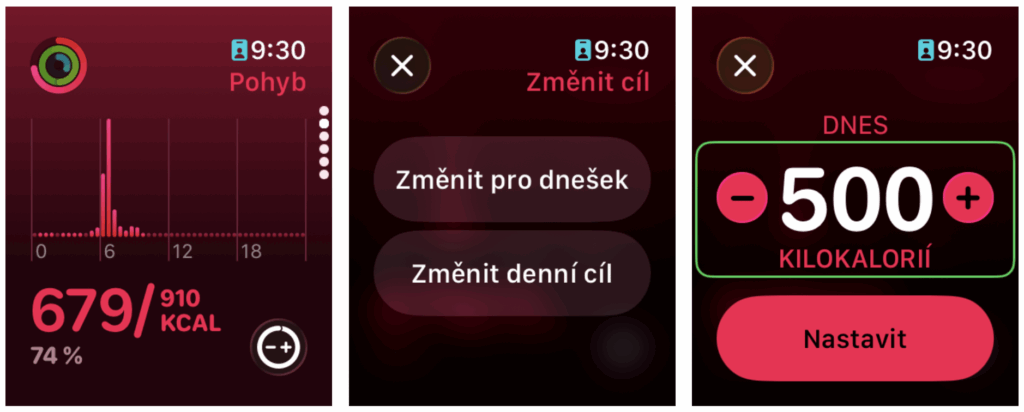 Při otevření aplikace Aktivita na Apple Watch je u jednotlivých kroužků ikona +-, kde si můžete změnit cíl buď na všechny dny, nebo jen pro dnešní den. Během plánovaného volného dne si tak mohu místo 910 kalorií nastavit cíl 500. To samé pak můžete udělat u kroužku cvičení a stání.